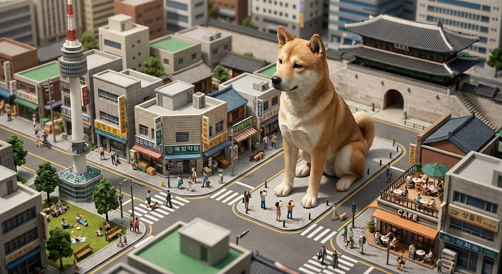 거대한 크기의 [오브젝트]가 서울 도심을 축소한 미니어처 세계의 한가운데 배치되어 있다. 오브젝트는 건물/랜드마크처럼 인식될 만큼 압도적인 스케일을 지니며, 주변에는 아주 작은 사람 피규어들이 출근, 산책, 사진 촬영, 카페 테라스에서 휴식 등 일상적인 행동을 하고 있다. 장면에는 서울 특유의 요소들이 자연스럽게 포함된다: 낮은 상가 건물, 한글 간판, 횡단보도, 가로수, 골목길, 버스정류장, 카페 테라스, 배달 오토바이.