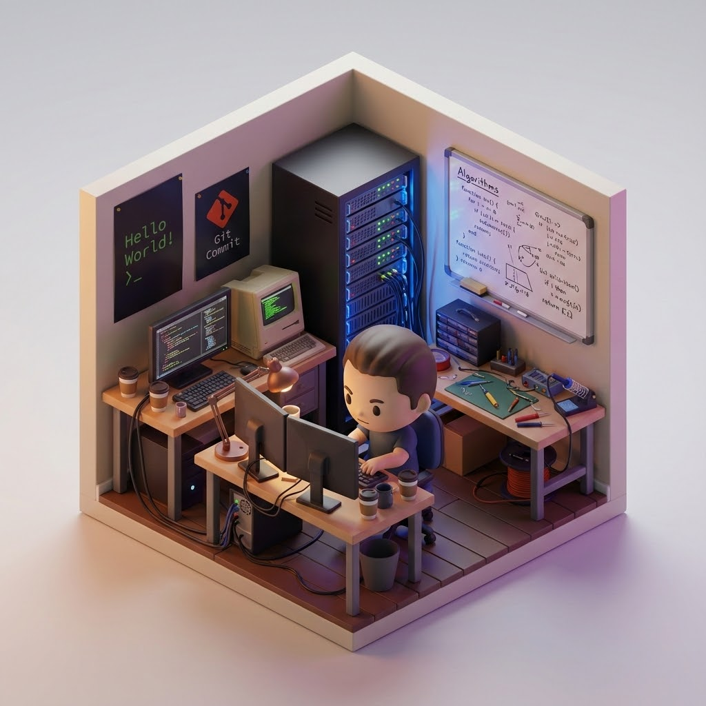Isometric 3D cube-shaped miniature room, true cube cutaway 구조로 모든 요소는 큐브 내부에만 배치된다. 공간은 [JOB: IT 개발자]의 세계관을 반영한 테마로 자동 구성되며, 가구·소품·벽 장식·작업 도구가 직업 특성에 맞게 자연스럽게 채워진다. Character: 업로드한 사람 사진을 기반으로 한 치비 스타일 피규어. 큰 머리와 작은 몸 비율의 마테 PVC 질감, 직업과 어울리는 행동과 표정을 취한다. (예: 작업 중, 설명 중, 연주 중 등 – 직업에 따라 자동 결정) Lighting: 직업 분위기에 맞춘 조명(따뜻한 실내광, 네온 포인트, 자연광 등 자동 선택), 부드러운 반사와 컬러 섀도우. Camera: 살짝 위에서 내려다보는 아이소메트릭 3/4 뷰, 큐브 전면 엣지 중앙 정렬. 초정돈된 미니어처 디테일, 깨끗한 배경, 워터마크 없음.
