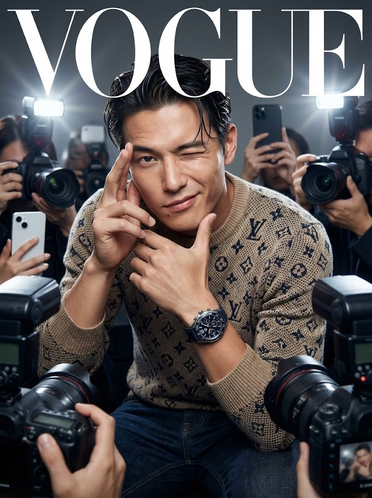 업로드된 사진의 얼굴을 원본으로 사용하여(얼굴 인식 100%), 현실적인 보그(Vogue) 매거진 커버 스타일의 패션 화보를 만들어 줘.